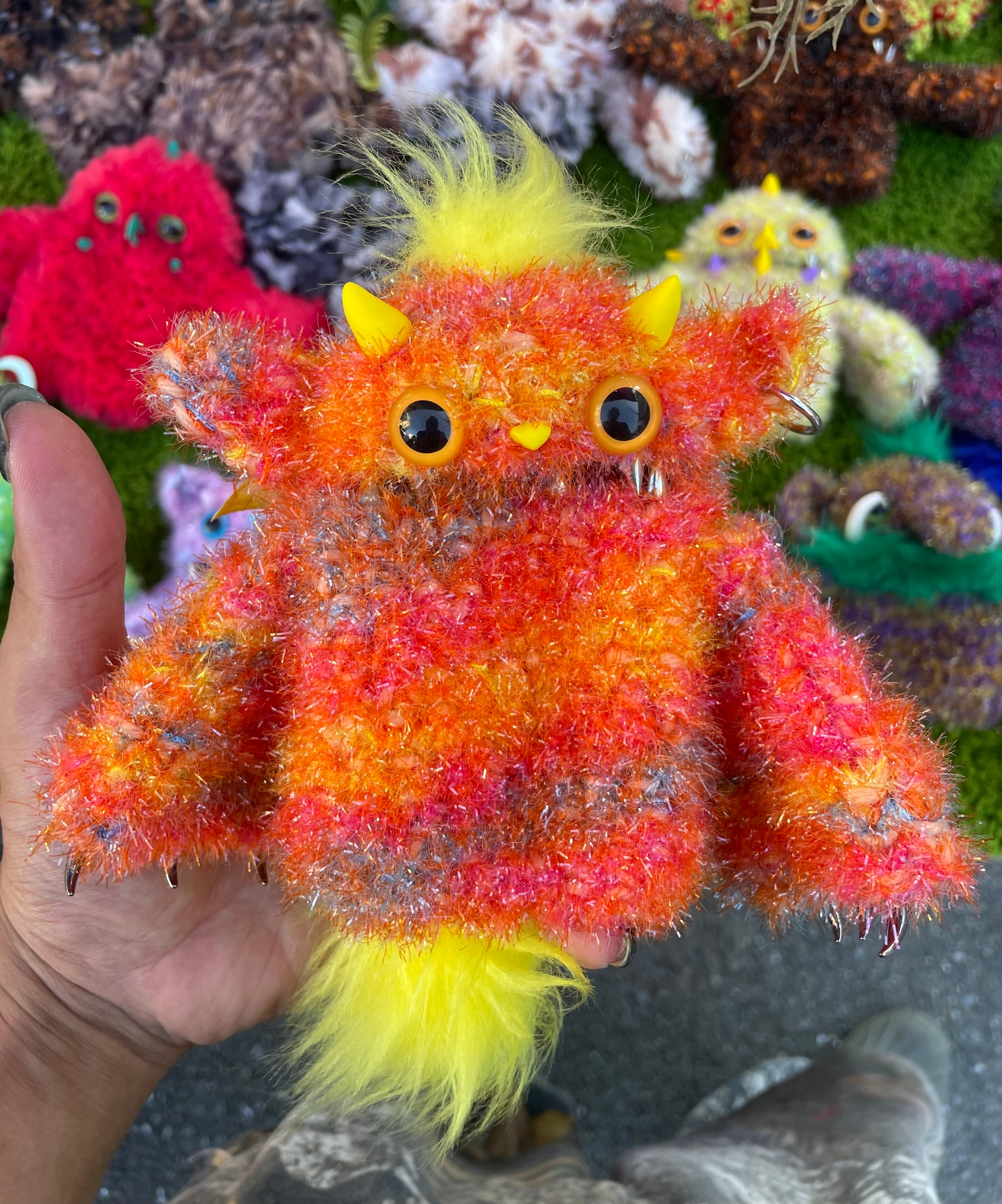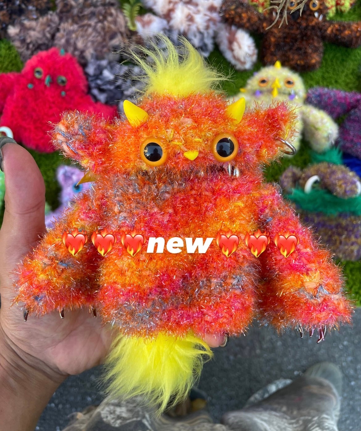 お腹の部分がポーチになっているデザインで、可愛さと実用性を兼ね備えています。このハンドメイド作品は、ツノやキバのパーツも一から丁寧に製作しており、細部にまでこだわった仕上がりになっています。普段使いはもちろん、友人へのプレゼントやコレクションアイテムとしても最適です!