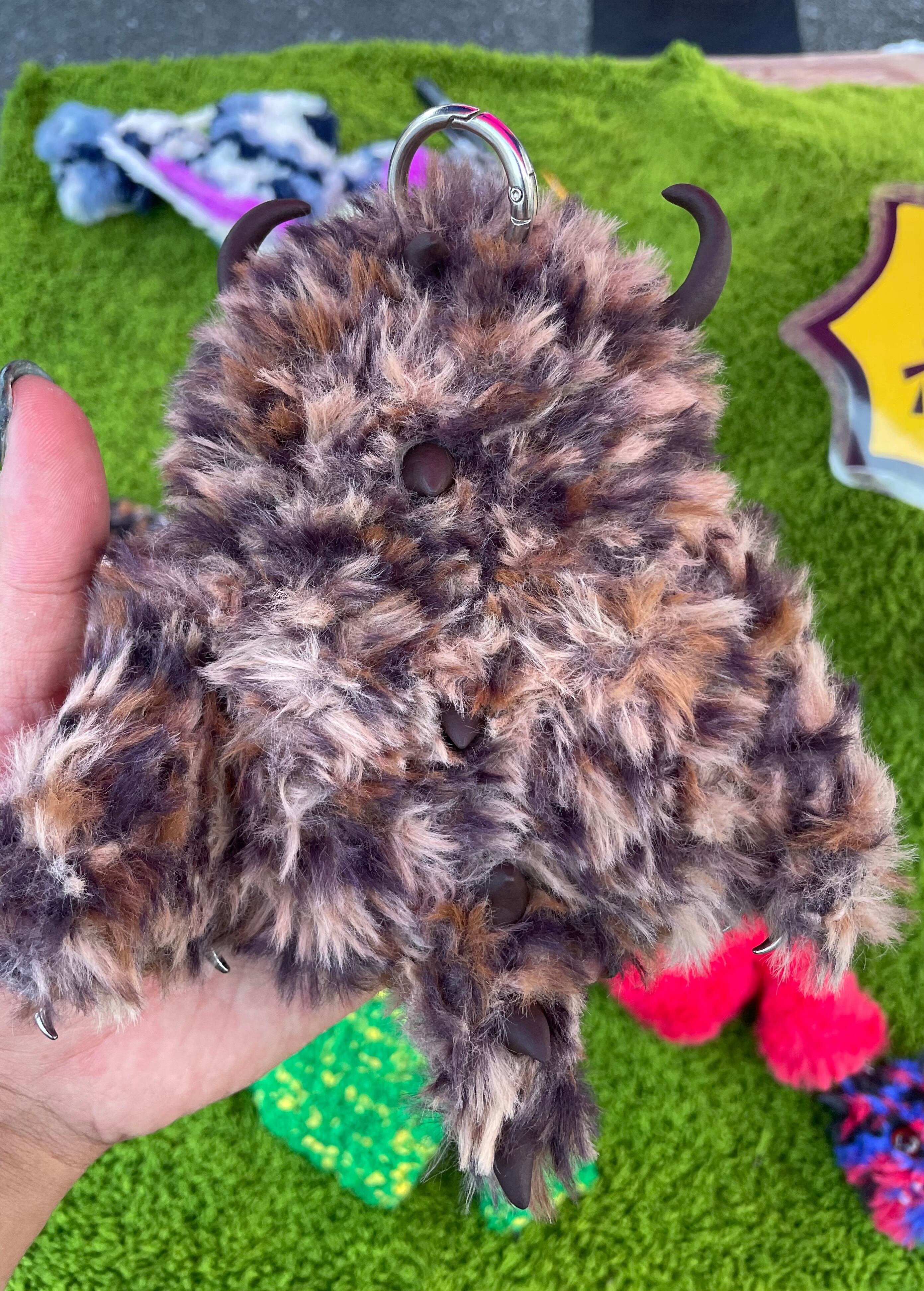 お腹の部分がポーチになっているデザインで、可愛さと実用性を兼ね備えています。このハンドメイド作品は、ツノやキバのパーツも一から丁寧に製作されており、細部にまでこだわった仕上がりになっています。普段使いはもちろん、友人へのプレゼントやコレクションアイテムとしても最適です!