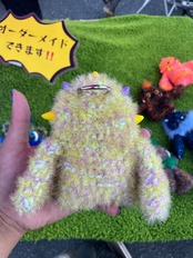 お腹の部分がポーチになっているデザインで、可愛さと実用性を兼ね備えています。このハンドメイド作品は、ツノやキバのパーツも一から丁寧に製作されており、細部にまでこだわった仕上がりになっています。普段使いはもちろん、友人へのプレゼントやコレクションアイテムとしても最適です!