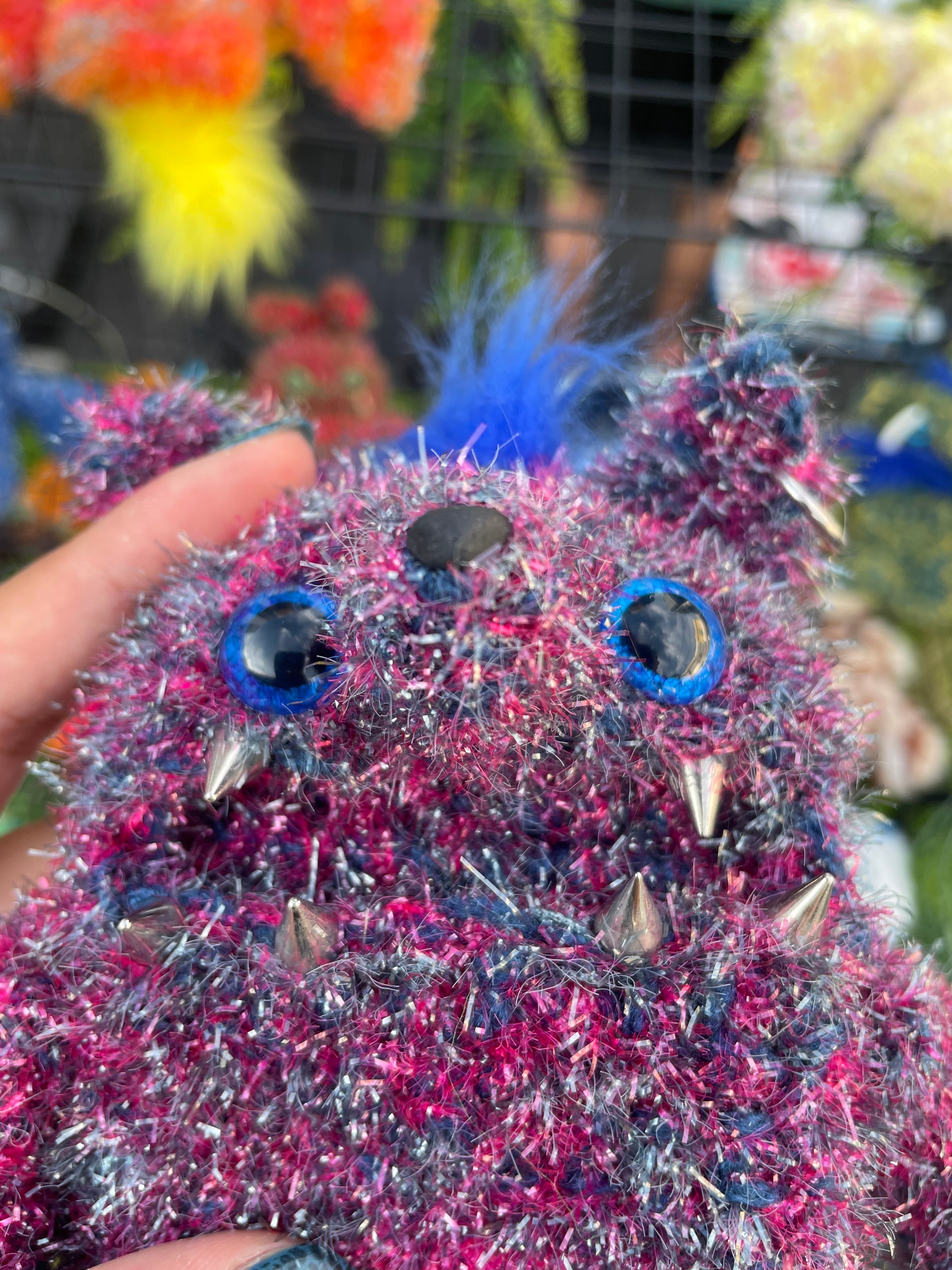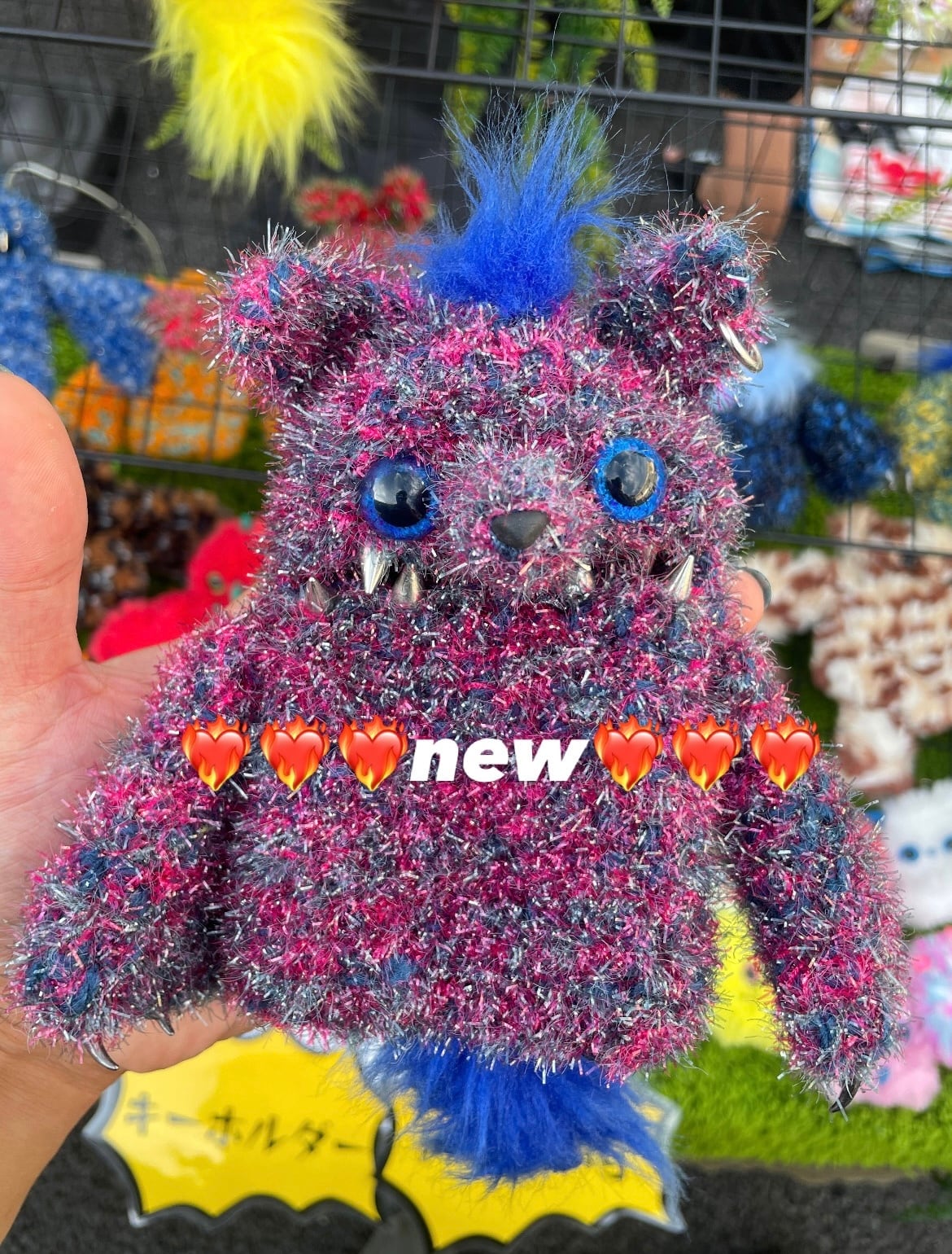 お腹の部分がポーチになっているデザインで、可愛さと実用性を兼ね備えています。このハンドメイド作品は、ツノやキバのパーツも一から丁寧に製作されており、細部にまでこだわった仕上がりになっています。普段使いはもちろん、友人へのプレゼントやコレクションアイテムとしても最適です!